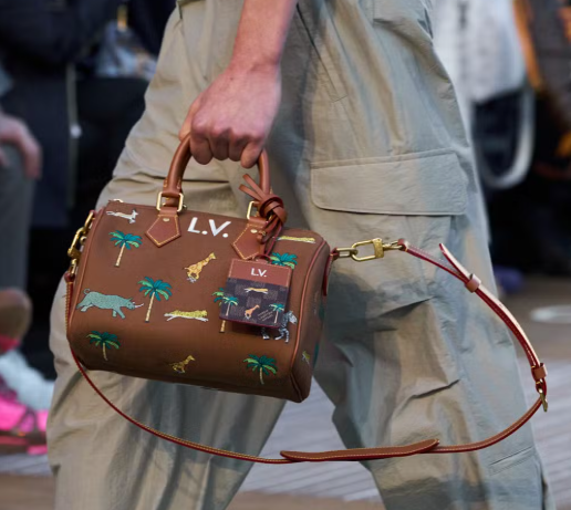 Os acessórios, aliás, traduzem bem o encontro entre passado e presente proposto pelo diretor criativo. Exemplo disso é a estampa criada especialmente para o filme Viagem a Darjeeling, de Wes Anderson, que se passa na Índia, e agora aparece pela primeira vez em um desfile da Louis Vuitton. O motivo inspirado pela fauna e pela flora, com elefantes, rinocerontes, girafas, zebras e palmeiras, aparece em modelos clássicos, como a Speedy.